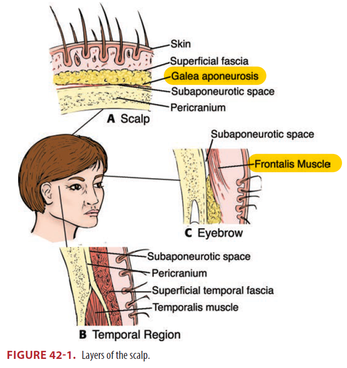 - Galea (머리덮개, 모상)의 열상은 subgaleal hematoma 방지하기 위해 흡수성 봉합사로 봉합을 시행.
