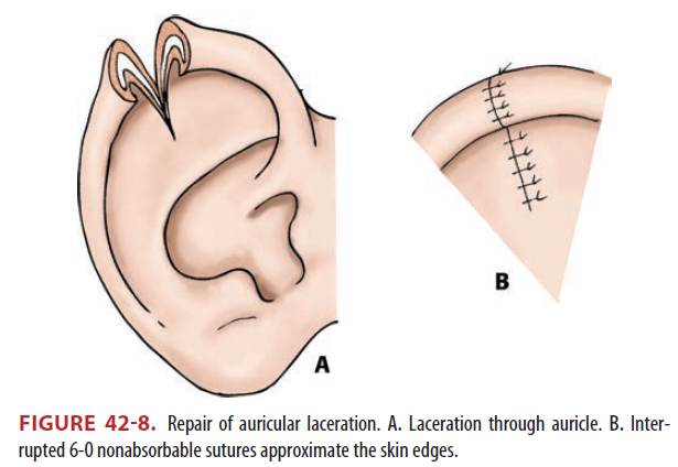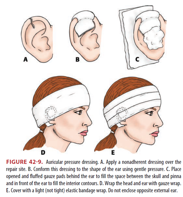 - 열상 봉합 후 perichondral hematoma 예방하기 위해 pressure dressing 시행. 24시간 내 재평가해서 hematoma 없으면 pressure dressing 제거.
