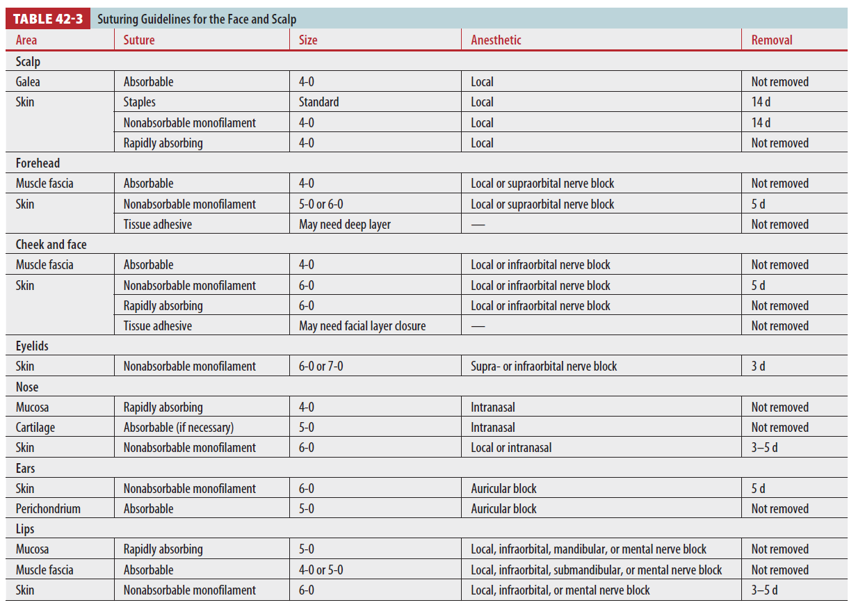 - Facial skin : nonabsorable monofilament suture, 경우에 따라 rapidly absorbable suture, tissue adhesives