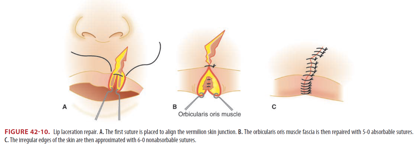 - 홍순경계(Vermilion border) 넘는 상처는 홍순경계의 edges를 정확히 맞추기 위해 6-0 nonabsorbable monofilament로 먼저 봉합하고 그 다음 vermilion과 skin을 같은 실로 각각 봉합. (점막과 근육층은 absorbable 5-0 suture)