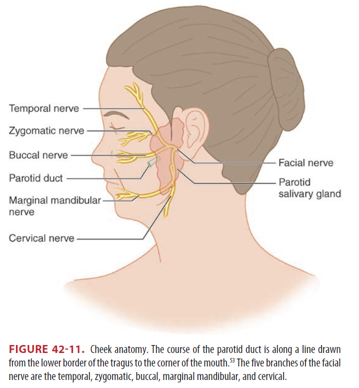 - Cheek area 봉합 시 주의해야 할 구조물: parotid duct(second maxillary molar 인접), branches of the facial nerve.